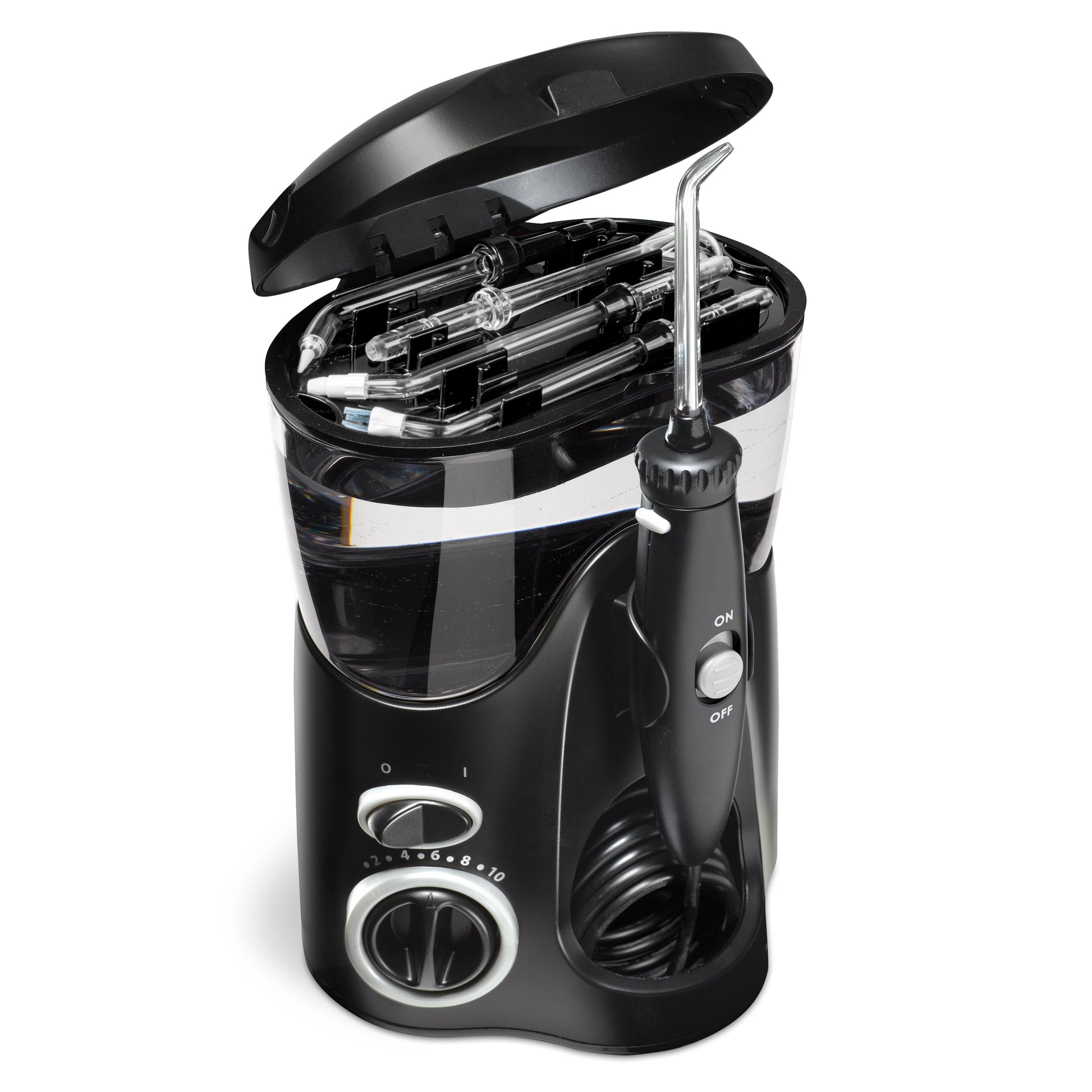 The Waterpik ® Ultra Water Flosser is the ultimate in water flossing performance. It features 10 pressure settings, a contemporary design that is smaller and quieter than previous models, a covered reservoir with in-lid tip storage, and 6 unique tips.
